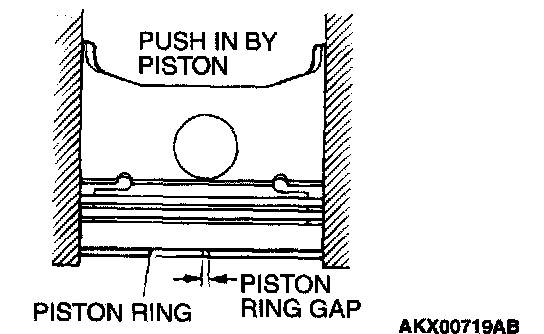 3. Insert the piston ring into the cylinder bore. Force the ring down with a piston, the piston crown being in contact with the ring, to correctly position it at right angles to the cylinder wall. Then, measure the end gap with a feeler gauge. If the ring gap is excessive, replace the piston ring.