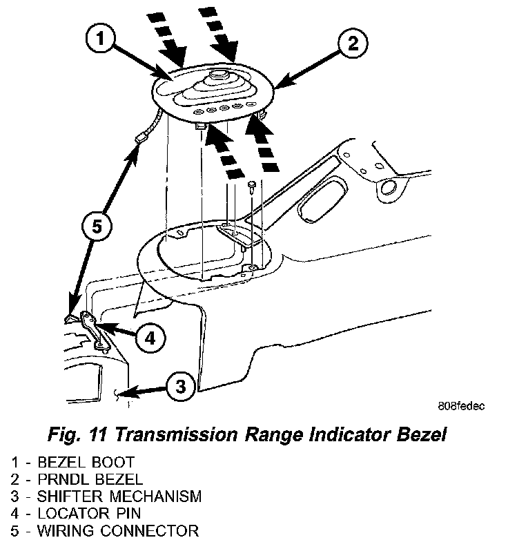 4. Remove transmission range indicator bezel by squeezing the sides slightly and lifting up until the locking tabs are free of the floor console. Refer to (Fig. 11) for pressure points.