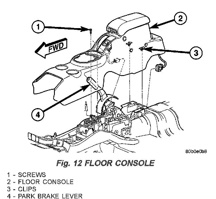 6. Remove screws, next to floor shifter and in console storage compartment, attaching floor console to brackets on floor pan (Fig. 12).