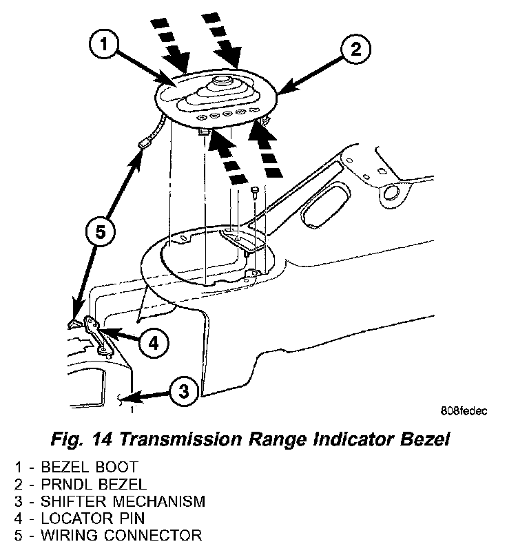 5. Connect transmission range indicator bezel wire connector on the underside of bezel (Fig. 14).