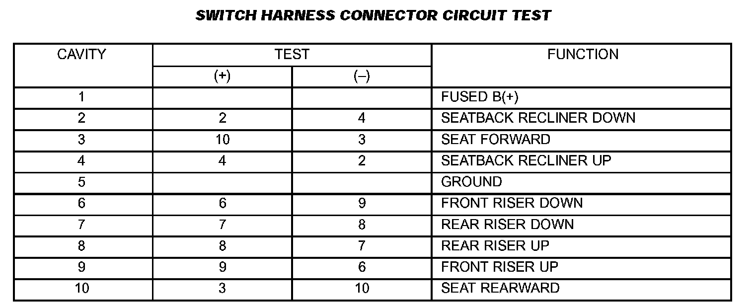 4. To test the seat motors, refer to the, and verify proper seat responses. Using two jumper wires, connect one to a battery supply and the second to a ground. Connect the other ends to the seat wire harness connector as described in the Switch Harness Connector Circuit Test table.