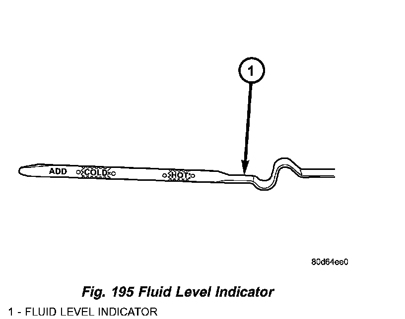 The torque converter fills in both the P Park and N Neutral positions. Place the selector lever in P Park to be sure that the fluid level check is accurate. The engine should be running at idle speed for at least one minute, with the vehicle on level ground. At normal operating temperature 82°C (180°F), the fluid level is correct if it is in the HOT region on the oil level indicator (Fig. 195). The fluid level should be within the COLD region of the dipstick at 27°C (80°F) fluid temperature.