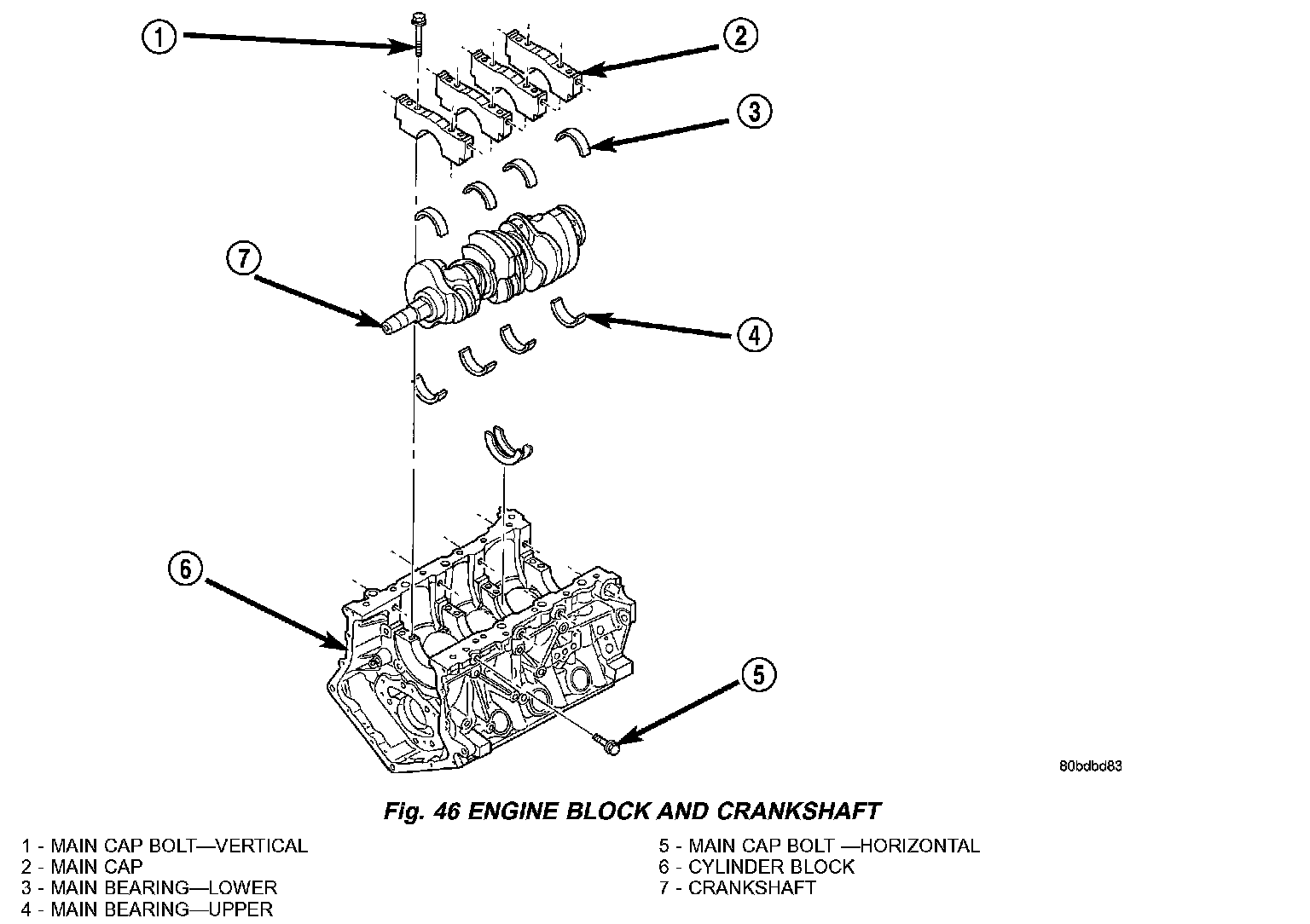 The cylinder block is made of heat treated aluminum with cast-in-place iron liners (Fig. 46). The block is a closed deck design with the right bank forward. To provide high rigidity and improved NVH, the block has cast-in contours and ribs, along with powdered metal 6 bolt main caps (4 vertical, 2 horizontal), with a die cast aluminum structural beam windage tray mounted to the main caps.
