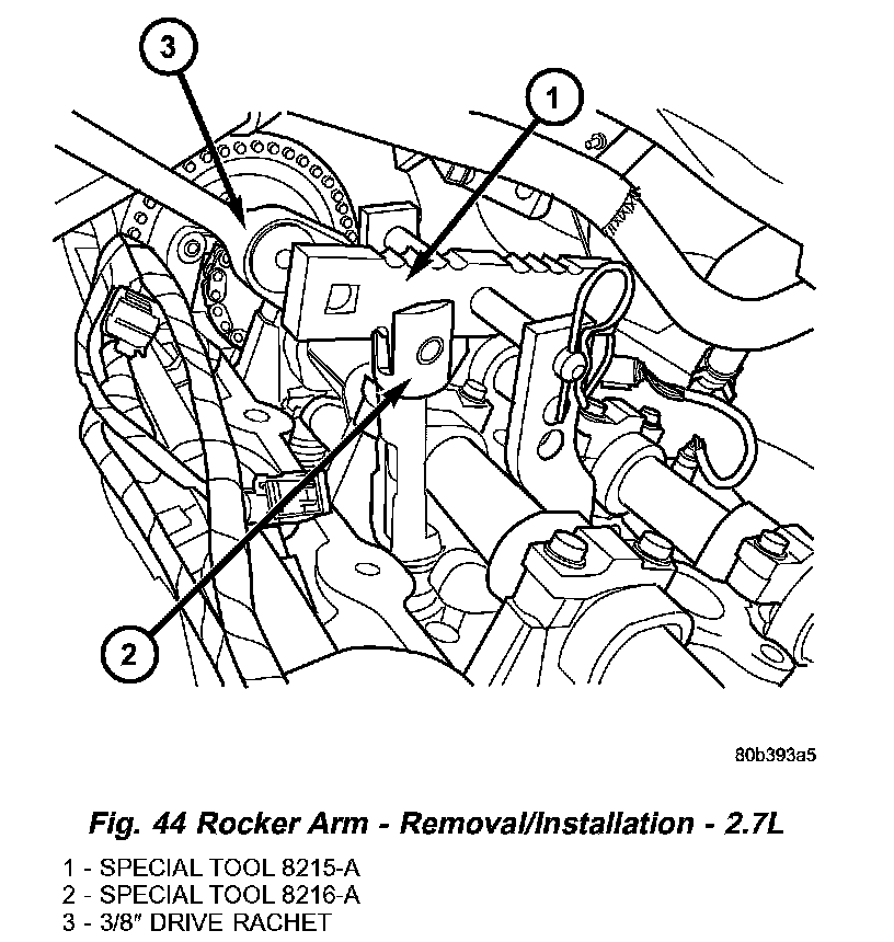 3. Using Special Tools 8215-A and 8216-A Adapter, depress valve spring only enough to release tension on rocker arm (Fig. 44).