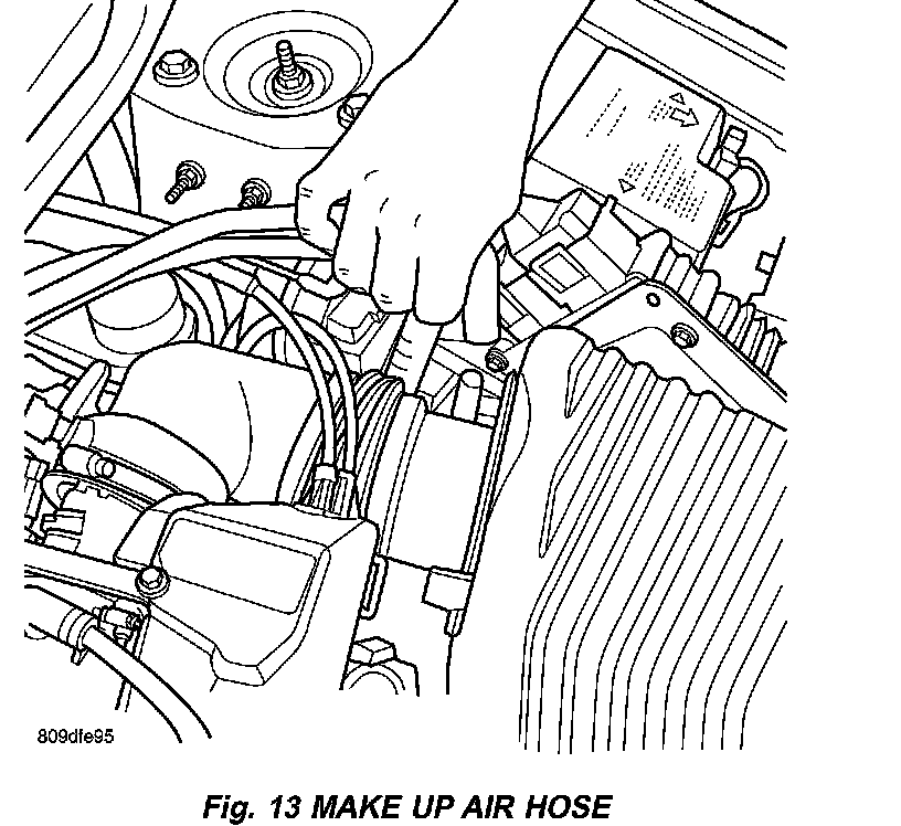 3. Disconnect fresh air makeup hose from throttle body air inlet hose (Fig. 13). Loosen clamp at throttle body (Fig. 14).