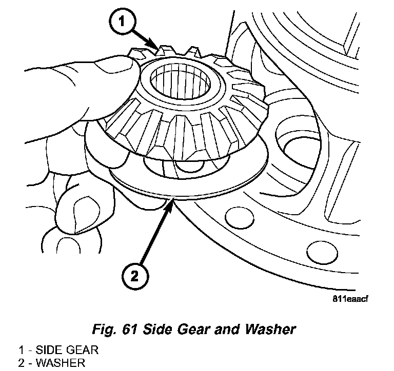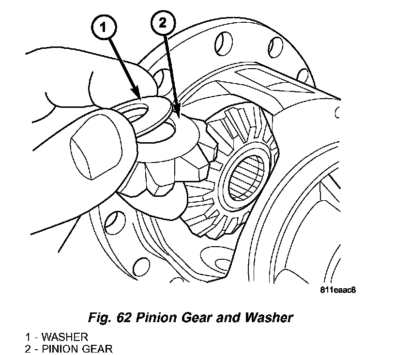 1. Install side gears, pinion gears, and thrust washers into case through opening and rotating into position (Fig. 61) (Fig. 62).