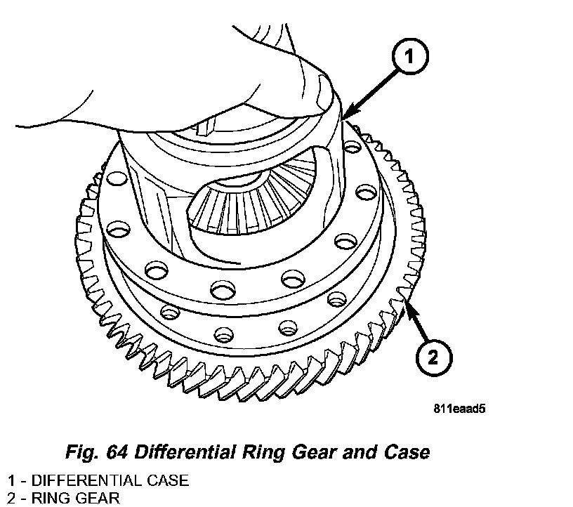 3. If previously removed, install ring gear to differential case (Fig. 64).