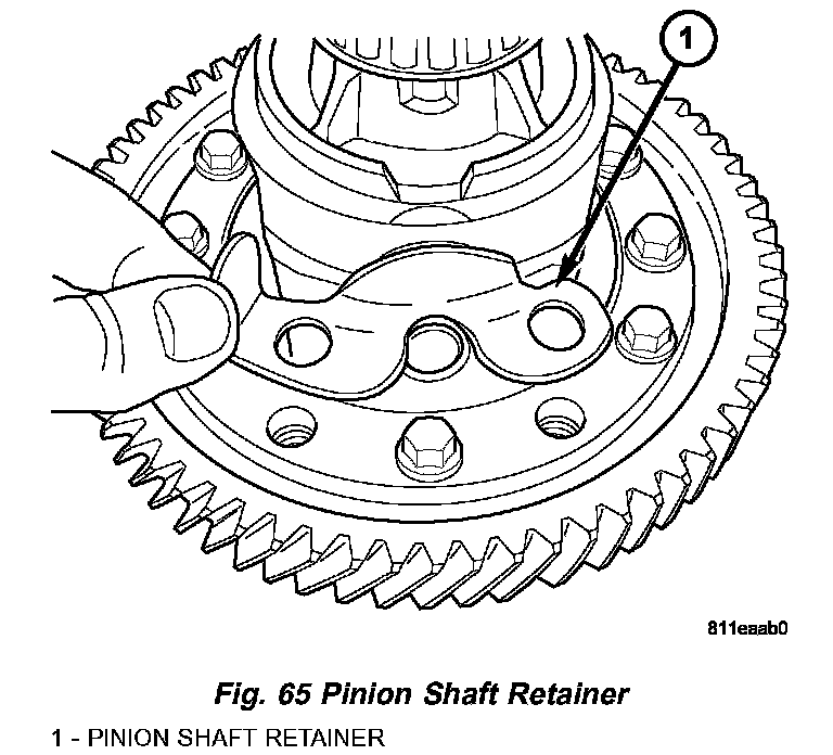 4. Install pinion shaft retainer (Fig. 65). Install NEW ring gear-to-case bolts and torque to 81 Nm (60 ft. lbs.) torque (Fig. 66).