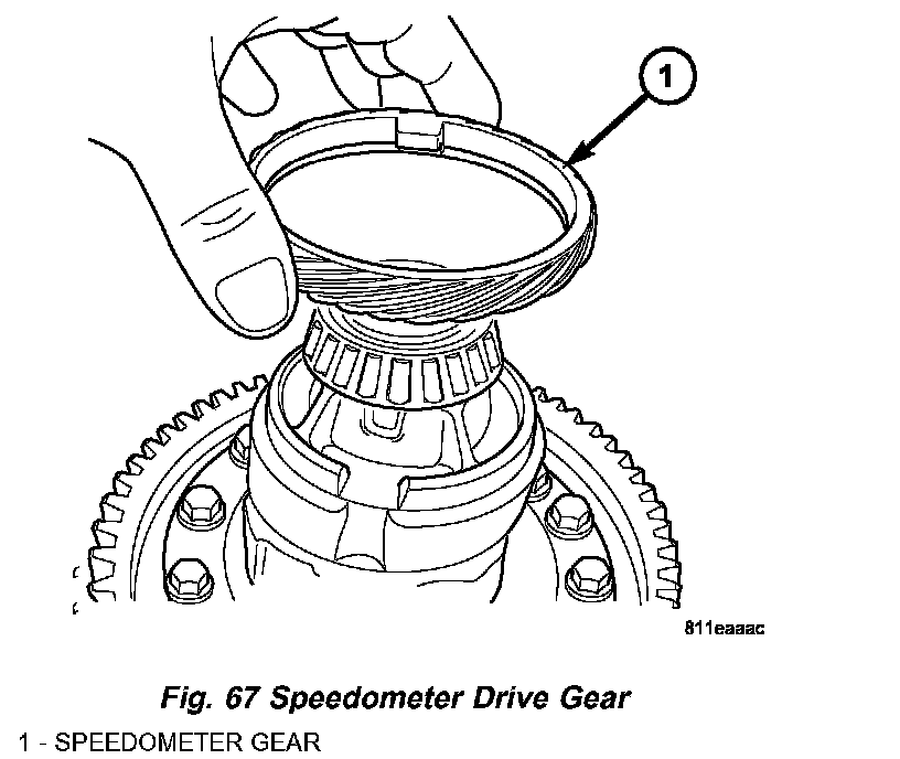 5. Install speedometer drive gear to case (Fig. 67). Note orientation of index tab.