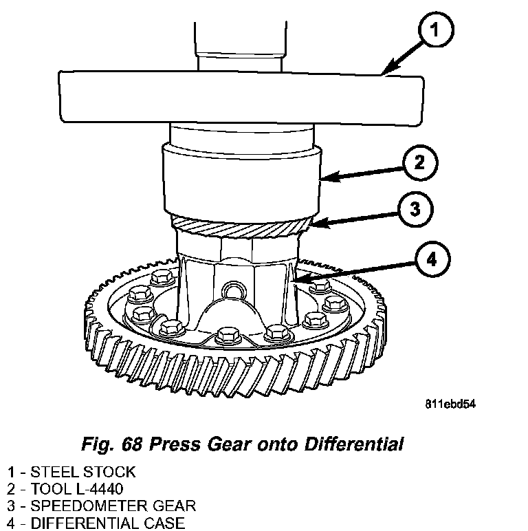 6. Using Steel Block and Tool L-4440, press speedometer drive gear into position (Fig. 68).