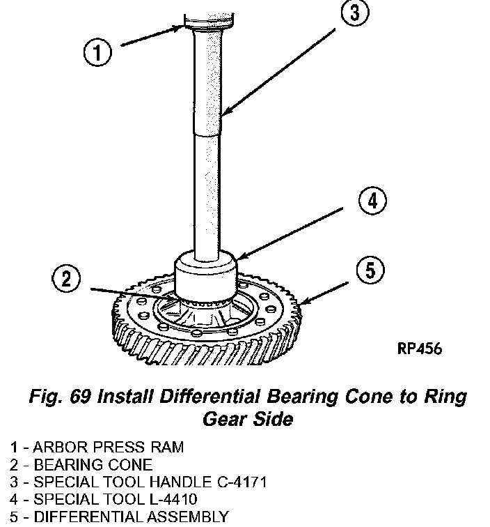 7. Using an arbor press, Handle C-417 1, and Tool L-4410, install differential side bearings to ring gear and case side (Fig. 69) (Fig. 70).