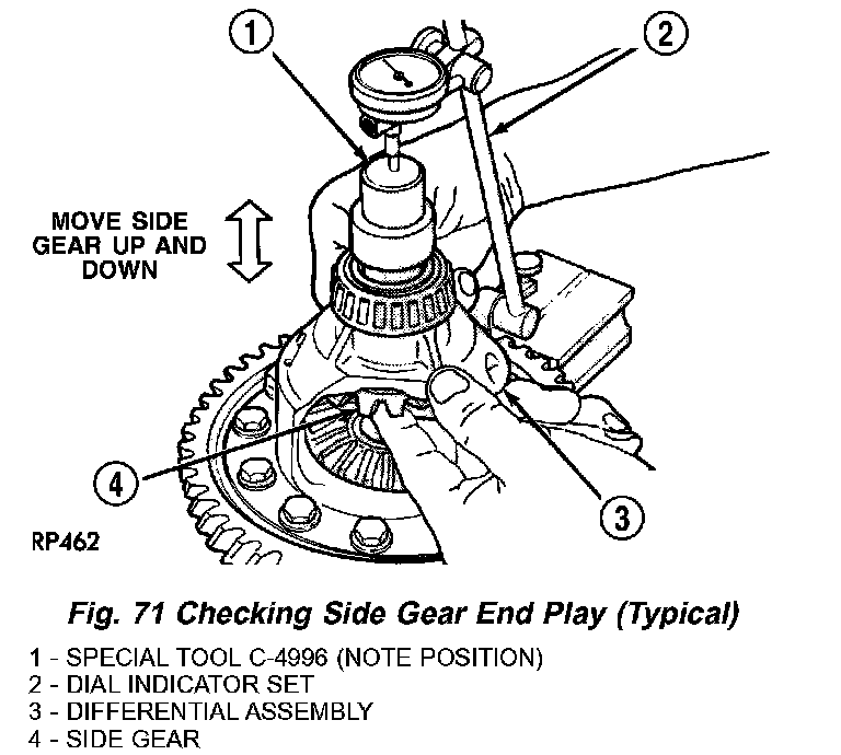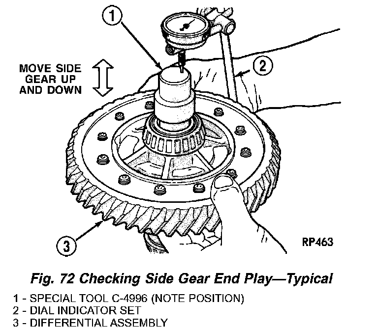 1. Rotate the assembly two full revolutions both clockwise and counterclockwise. Set up dial indicator as shown and record end play (Fig. 71) (Fig. 72). Rotate side gear 90 degrees and take another measurement. Again, rotate side gear 90 degrees and record a final measurement.