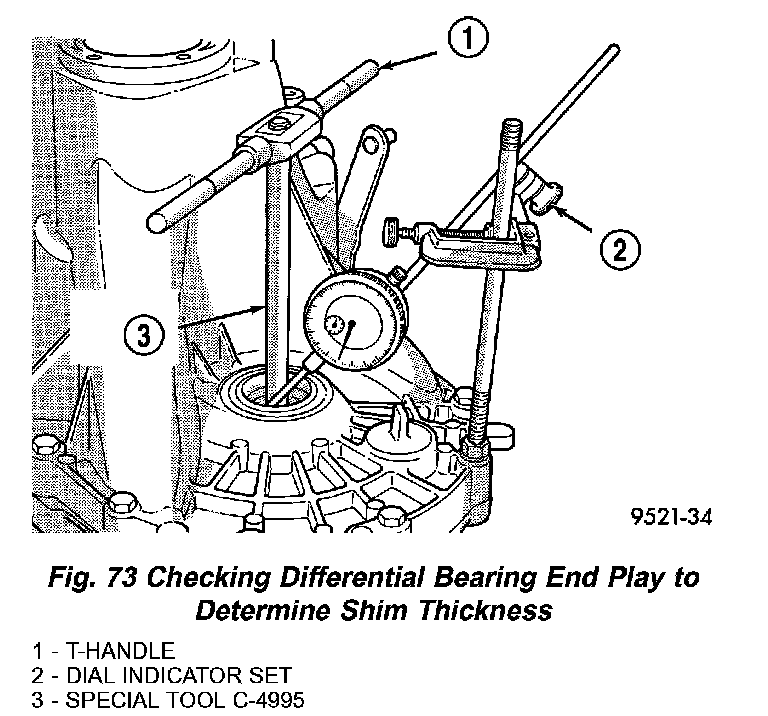 6. Apply a medium load to differential with Tool C-4995 and a T-handle, in the downward direction. Roll differential assembly back and forth a number of times. This will settle the bearings. Zero the dial indicator. To obtain end play readings, apply a medium load in an upward direction while rolling differential assembly back and forth (Fig. 73). Record end play.