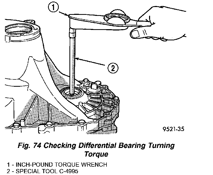 10. Using Special Tool C-4995 and an inch-pound torque wrench, check turning torque of the differential assembly (Fig. 74). The turning torque should be 6 to 12 inch lbs. If the turning torque is too high, install a 0.05 mm (0.002 inch) thinner shim. If the turning torque is too low, install a 0.05 mm (0.002 inch) thicker shim.