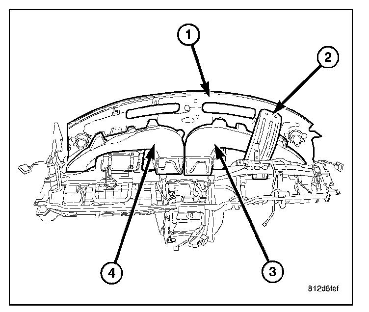4. Remove the four screws that secure the passenger side instrument panel duct and demister duct assembly (4) to the instrument panel and remove the duct assembly.