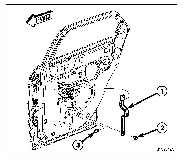 12. Loosen the screw that secures the bottom of the regulator rail to the keyed hole (3) on the inside of the door.
