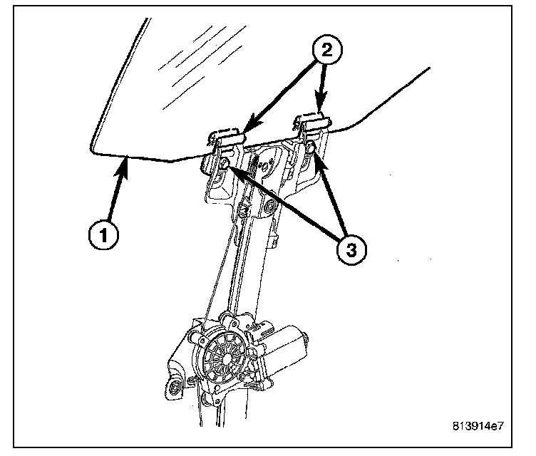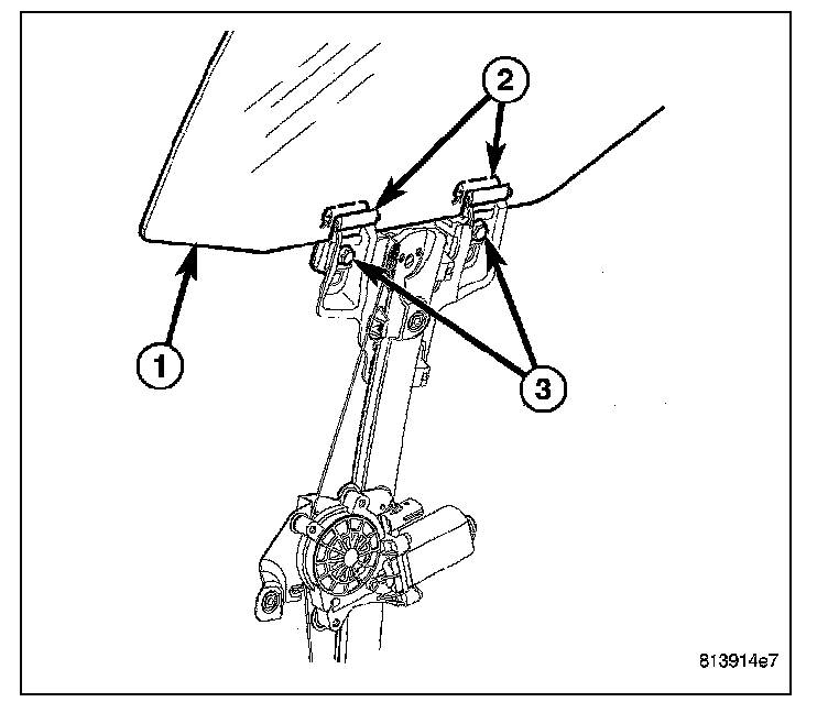 8. Using the regulator, lower the glass far enough to access the two window regulator glass clamp screws (3).