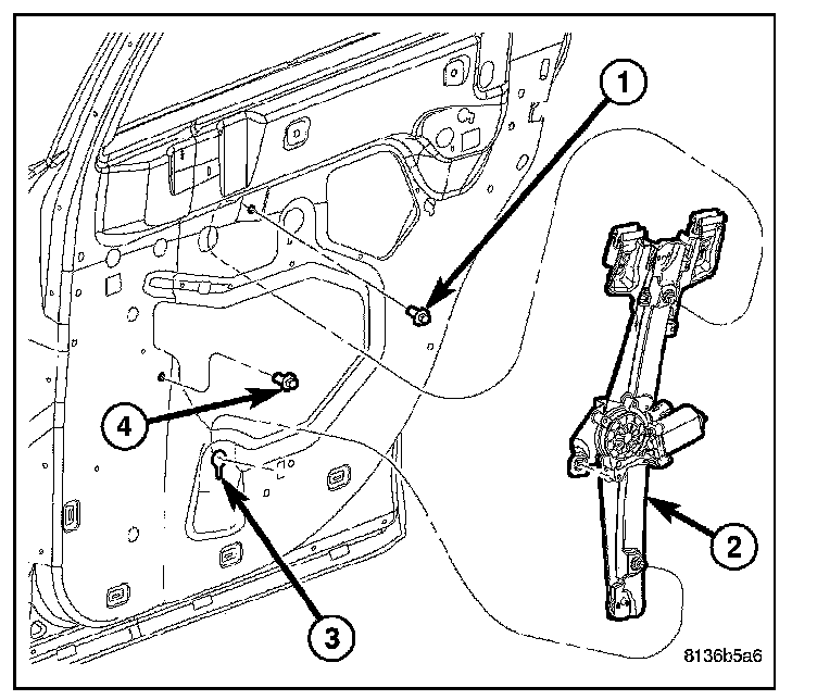 5. Install and tighten the screw (4) that secures the regulator motor support bracket to the inside of the door. Tighten the screw to 10 N.m (90 in.lbs.).