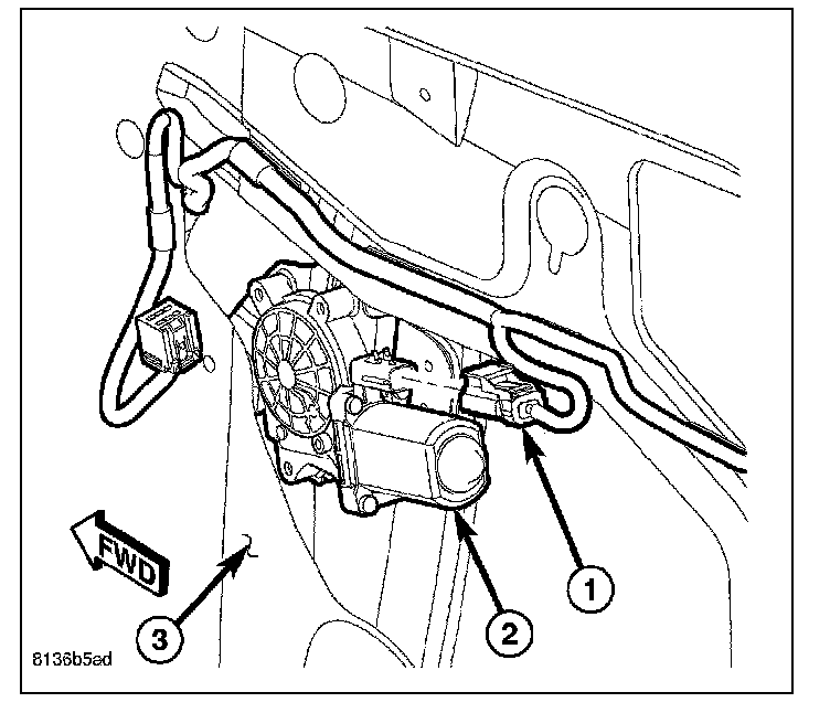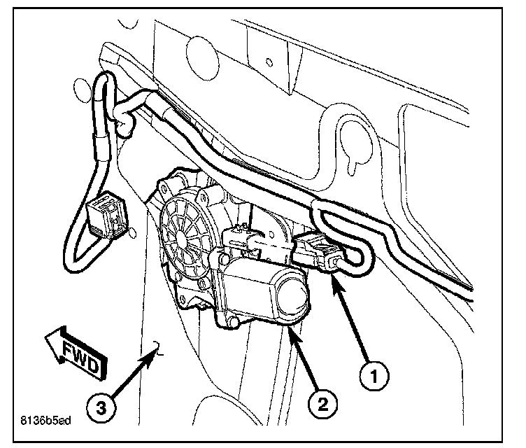 14. Lower the rear regulator within the door (3) far enough to access and disconnect the door wire harness connector (1) from the regulator motor (2) through the large access hole on the inside of the door near the front.