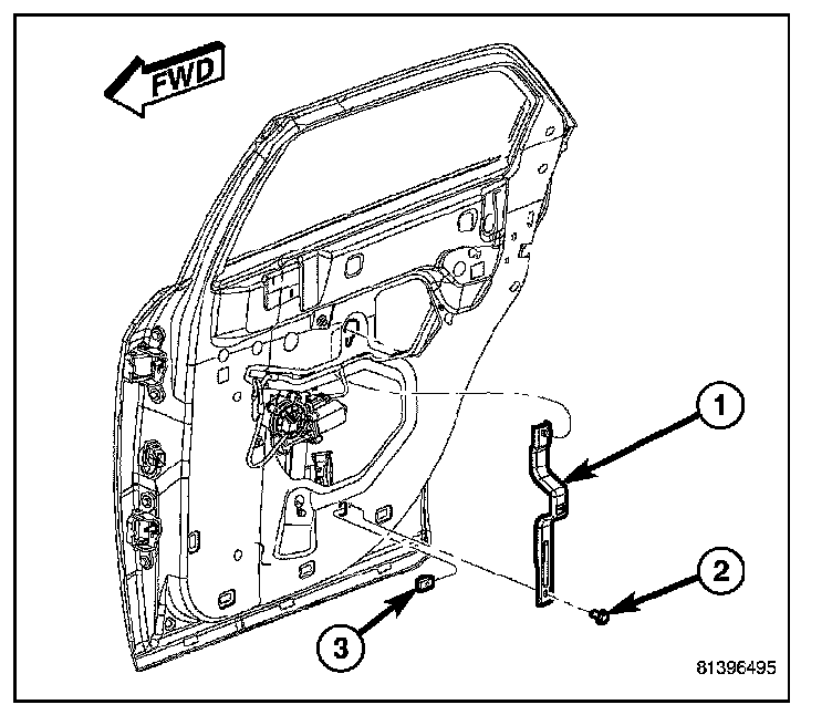 3. Engage the screw at the bottom of the rear regulator rail (2) into the keyed hole (3) on the inside of the door near the bottom.