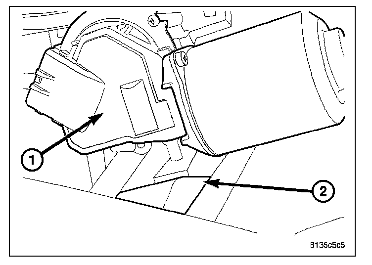 2. While positioning the wiper module in its mounting location, make sure that the dowel on the bottom of the wiper motor (1) slides into the mounting grommet (2) correctly.