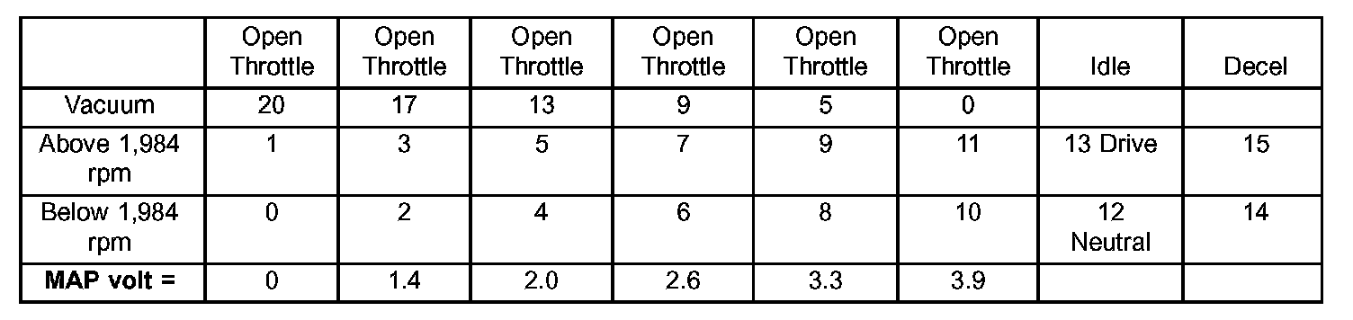 Their number of cells varies upon the driving conditions. Two cells are used only during idle, based upon TPS and Park/Neutral switch inputs. There may be two other cells used for deceleration, based on TPS, engine rpm, and vehicle speed. The other twelve cells represent a manifold pressure and an rpm range. Six of the cells are high rpm and the other six are low rpm. Each of these cells has a specific MAP voltage range Typical Adaptive Memory Fuel Cells.
