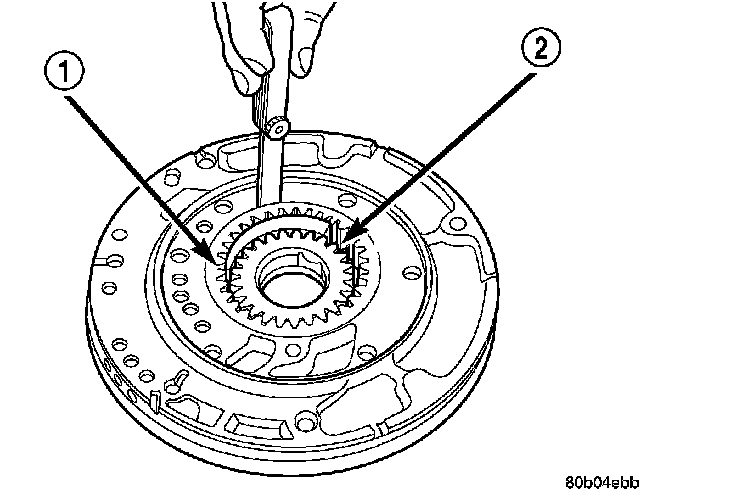 5. Measure the clearance between the outer gear (1) and the pump pocket (2). Clearance should be 0.089 - 0.202 mm (0.0035 - 0.0079 inch).