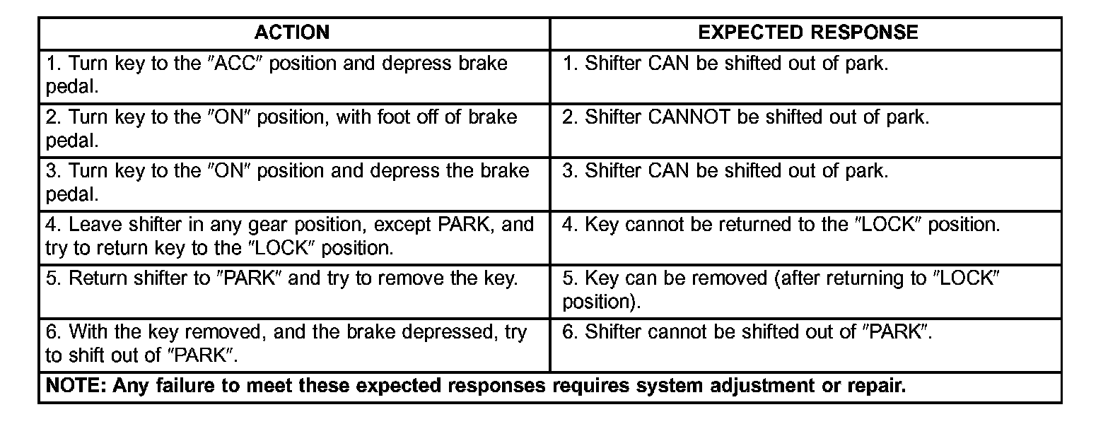 The following chart describes the normal operation of the Brake Transmission Shift Interlock (BTSI) system. If the expected response differs from the vehicles response, then system repair and/or adjustment is necessary.