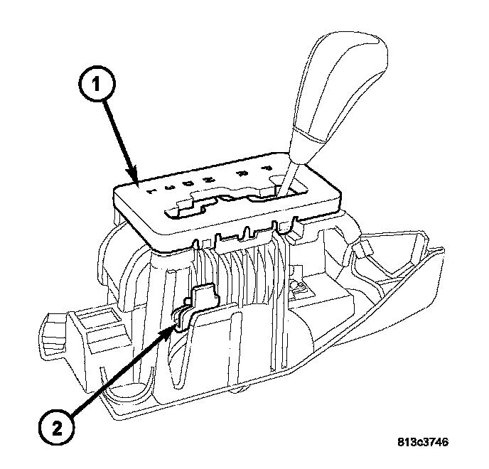 3. Depress the BTSI override (2) on the side of the shifter assembly (1).