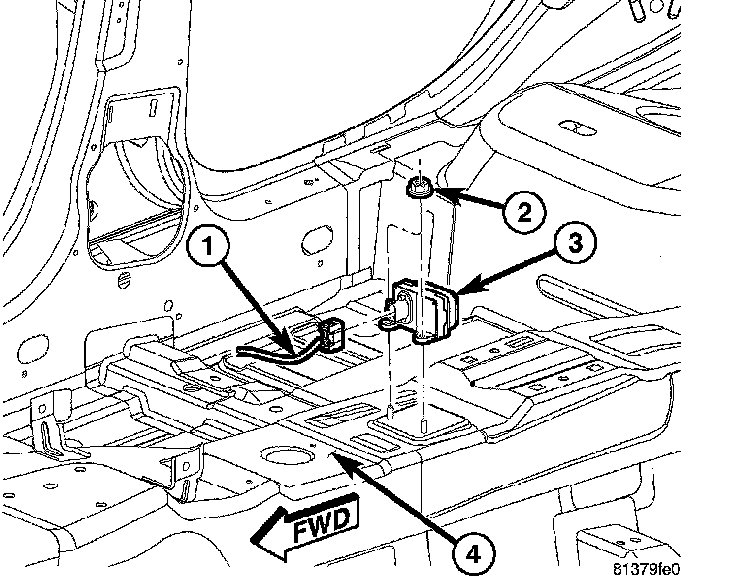 1. Install dynamics sensor (3) over studs mounted to floor pan tunnel (4).