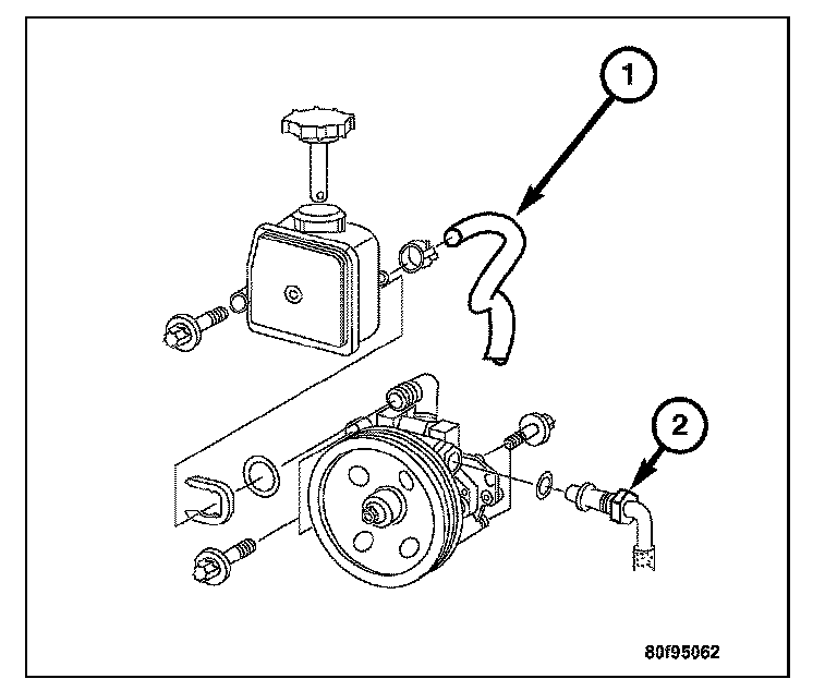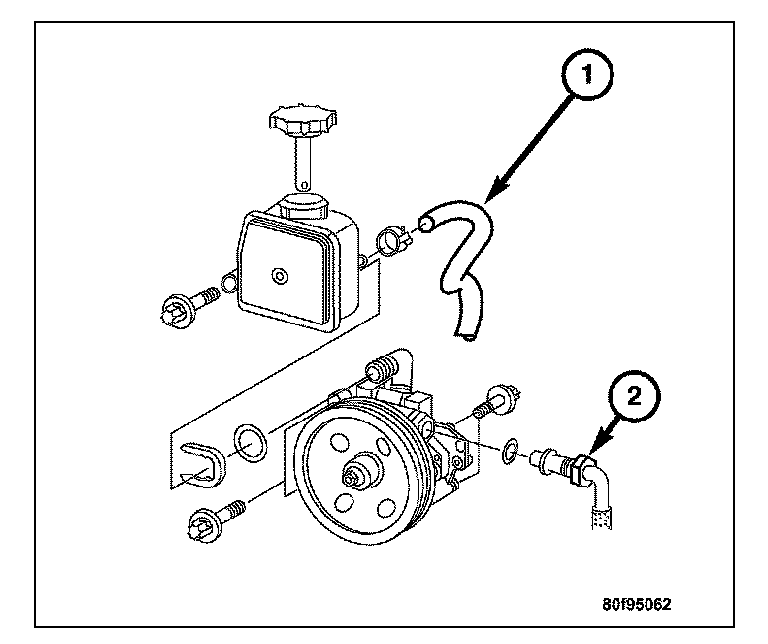 11. Disconnect the pressure (2) and return (1) lines from the power steering pump.