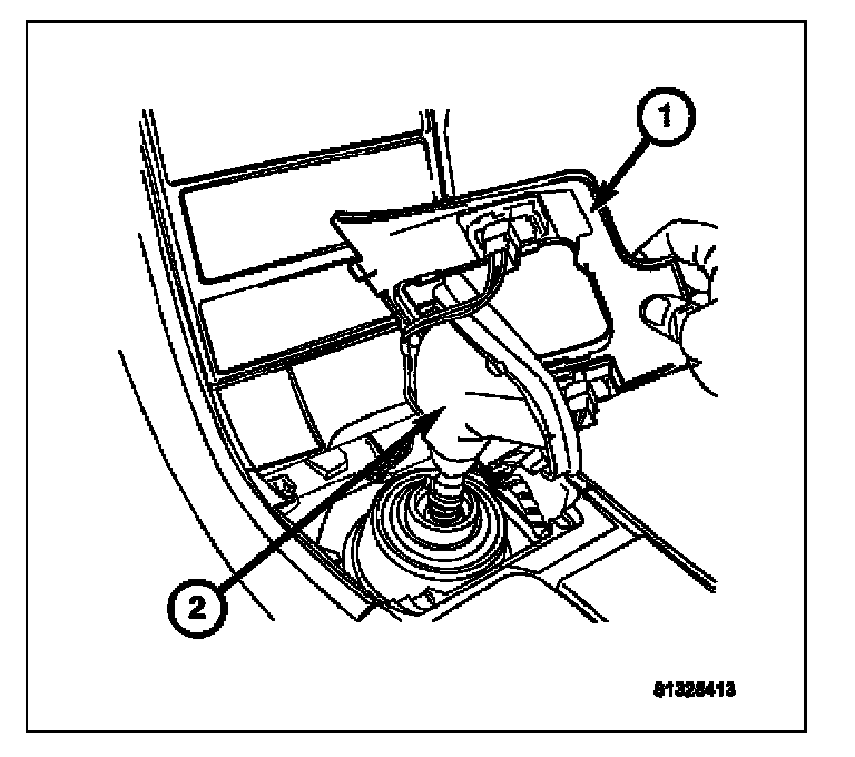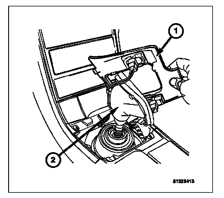 4. Slide the shifter bezel (1) over the leather shifter boot (2) and lay the bezel on the side of the console.