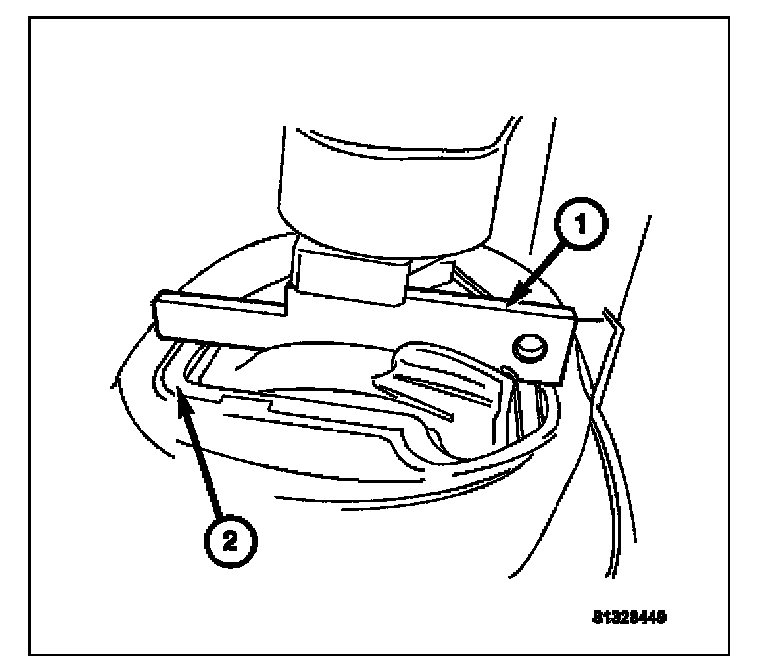 7. Lift up on the shifter knob and move the shifter to the full left position. Place the Special Tool 9120 (1) onto the shifter alignment slot at the base of the shifter housing (2).Ensure that the recessed portion of the tool is facing upward.