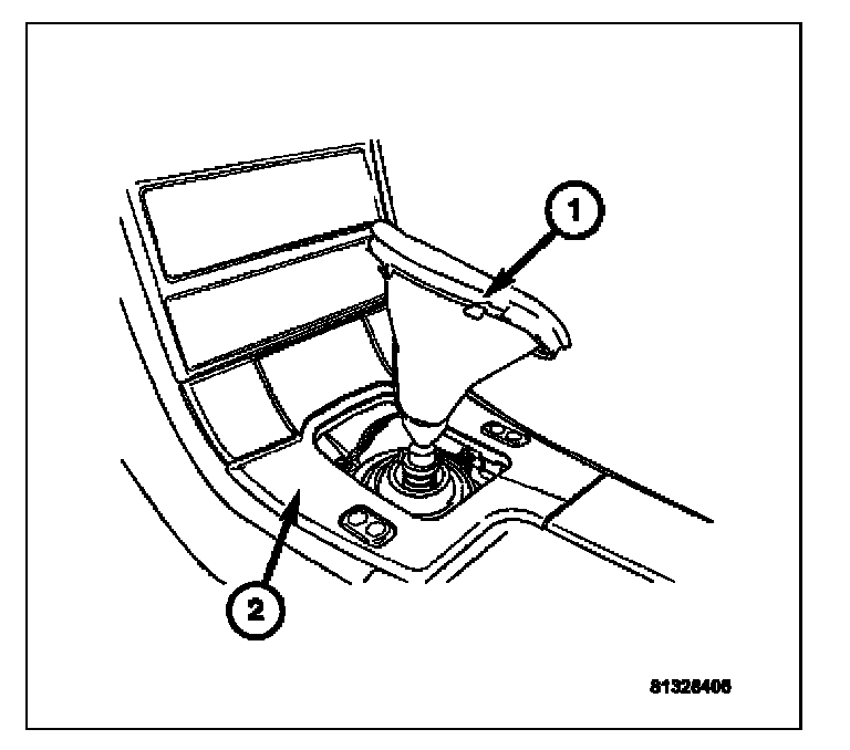 14. Install the shifter bezel (1) over the leather shifter boot (2). Carefully press firmly down in all four corners of the shifter bezel until it locks into place.