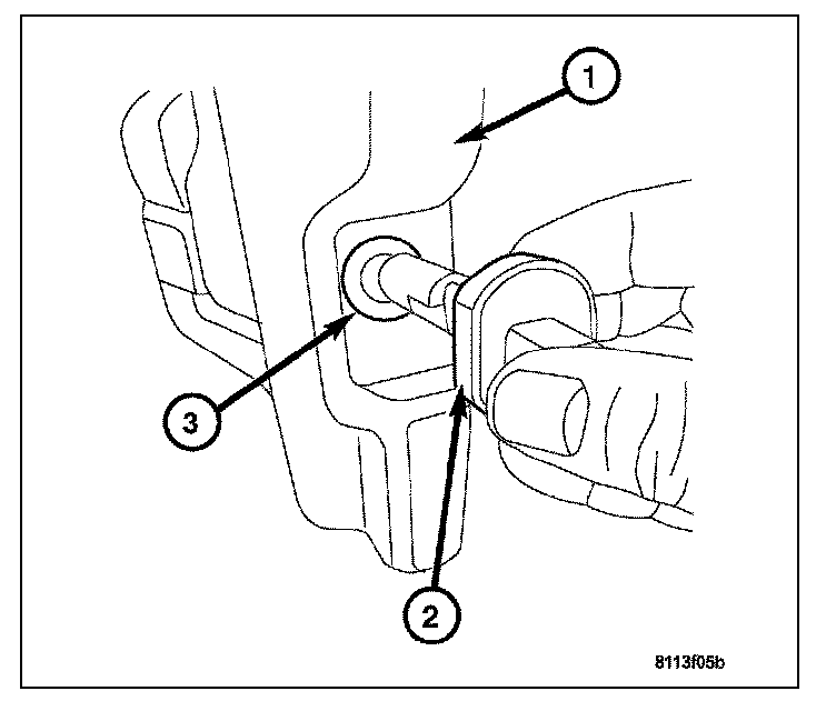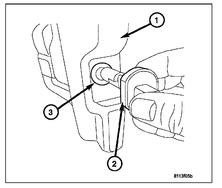 2. Gently pry outward on the body of the washer fluid level switch (2) and pull it away from the rubber grommet (3).