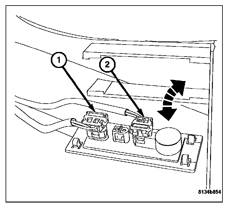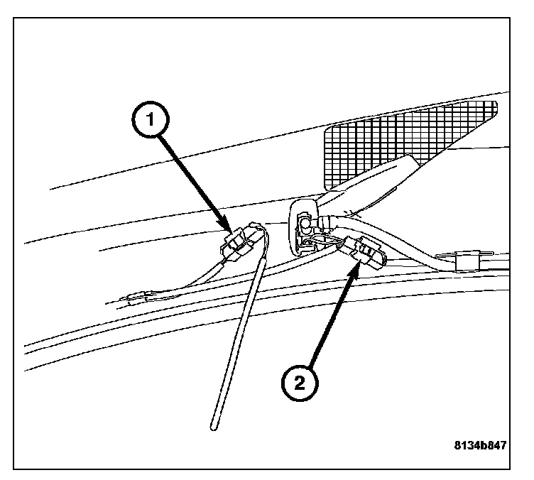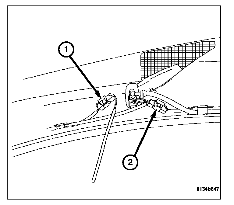 5. Disconnect the washer nozzle harness connector (2) from the nozzle.