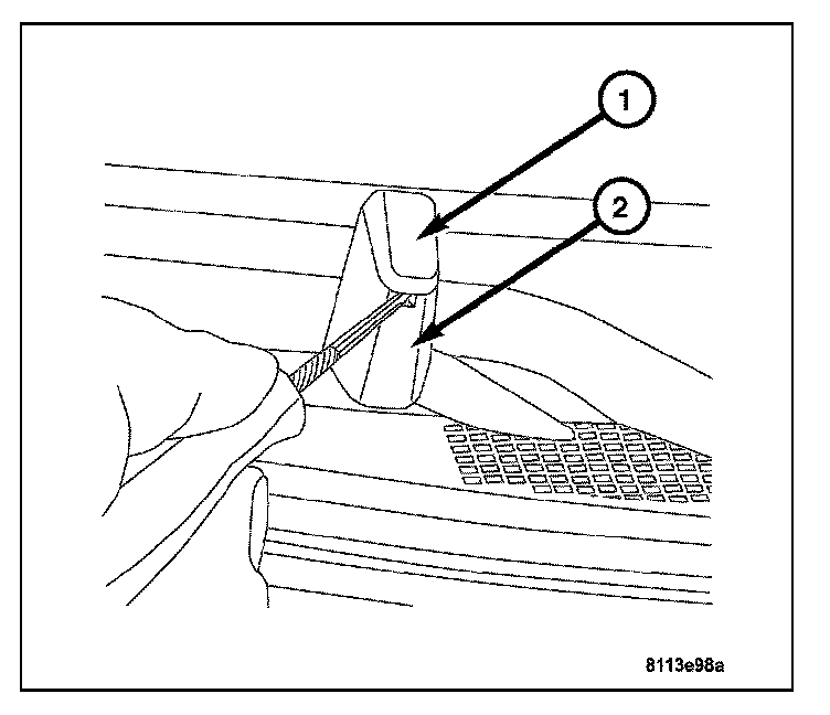 6. Insert a small screwdriver into the slot between the washer nozzle (1) and the cowl grille (2) pressing inward to release the retaining clip.