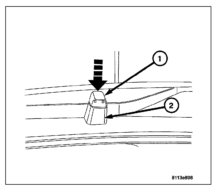 1. Install the washer nozzle (1) into the cowl grille (2). Press downward with a rocking motion until the retaining clip is fully seated.
