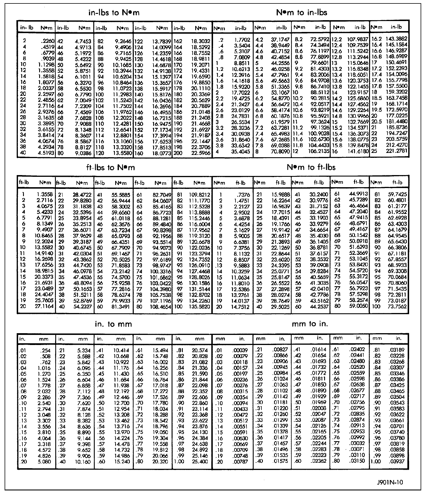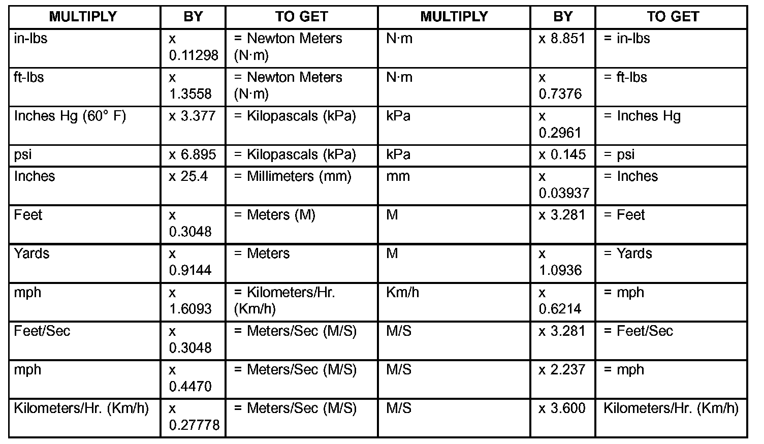 Refer to the Metric Conversion Chart to convert torque values listed in metric Newton- meters (N.m). Also, use the chart to convert between millimeters (mm) and inches (in.).