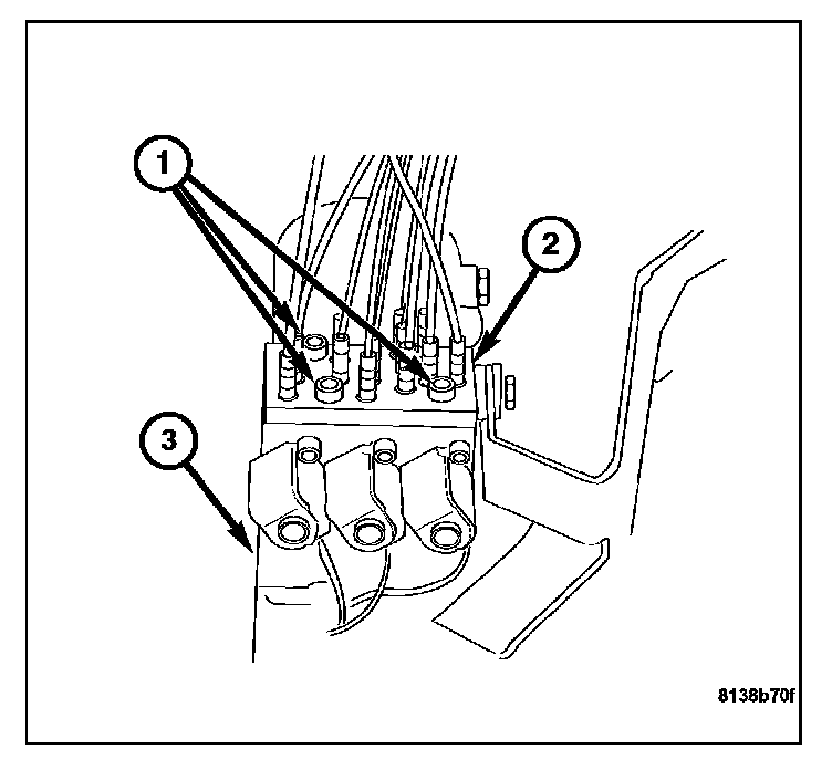 7. Remove the three bolts (1) from the hydraulic line retaining plate.