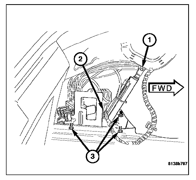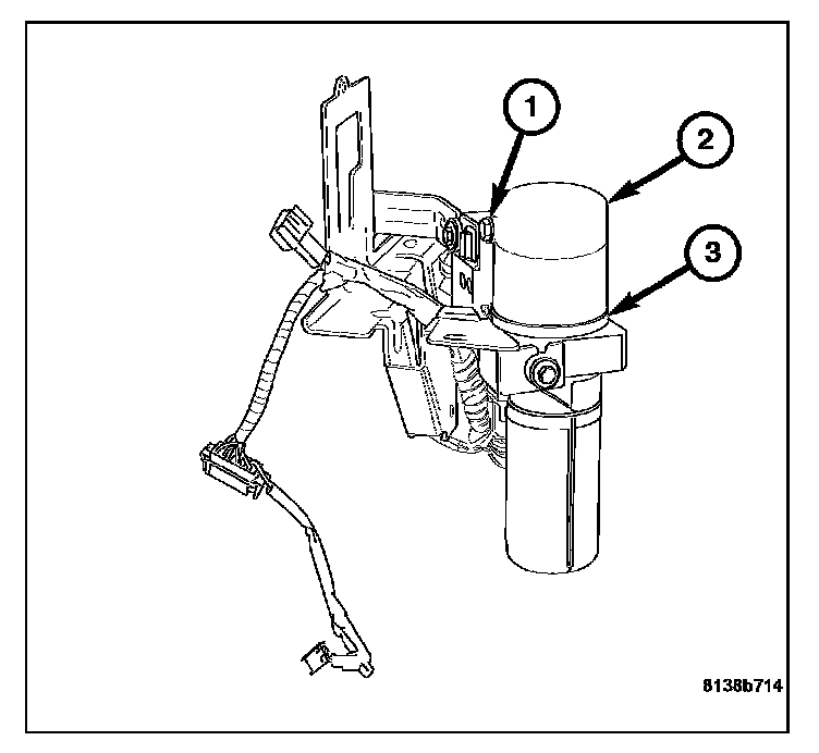 2. Position the hydraulic pump assembly on the mounting studs in the trunk well. Install the retaining nuts (3). Torque the nuts to 8.5 N.m (75 in.lbs.).