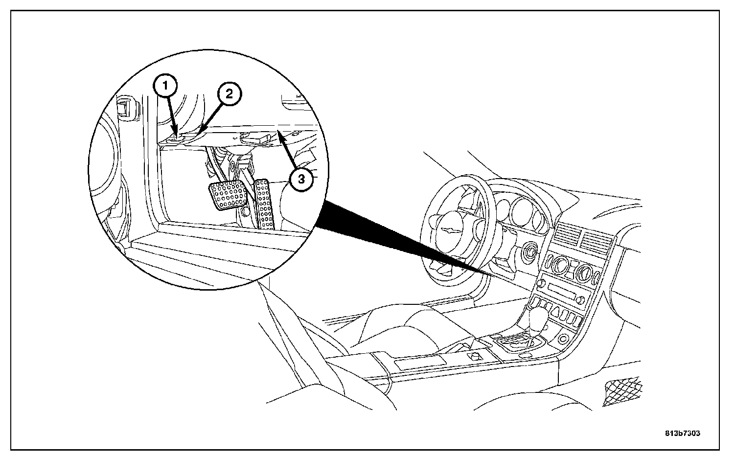 The Data Link Connector (DLC) (1) is located at the lower edge of the instrument panel (3) near the hood release (2). The exposed connector terminals are protected by a plastic cover which flips open if access is needed.