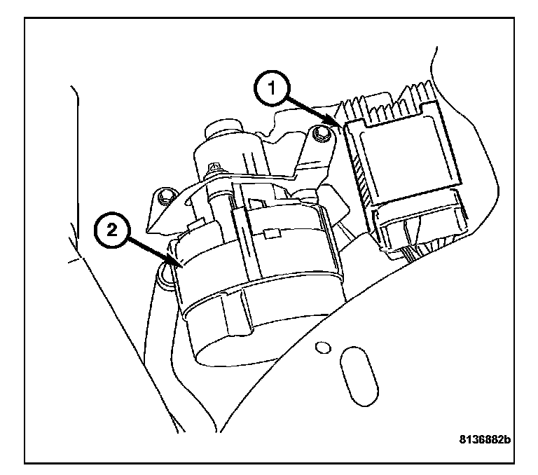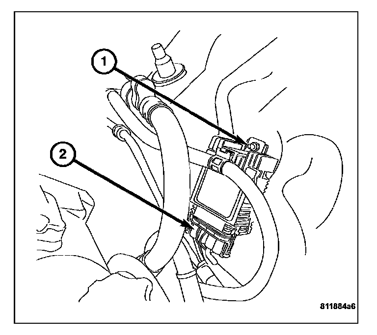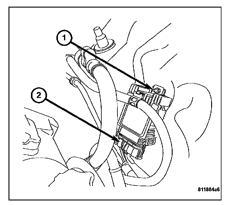 1. Position the radiator fan control module (1) on the inner fender well studs next to the air pump (2).