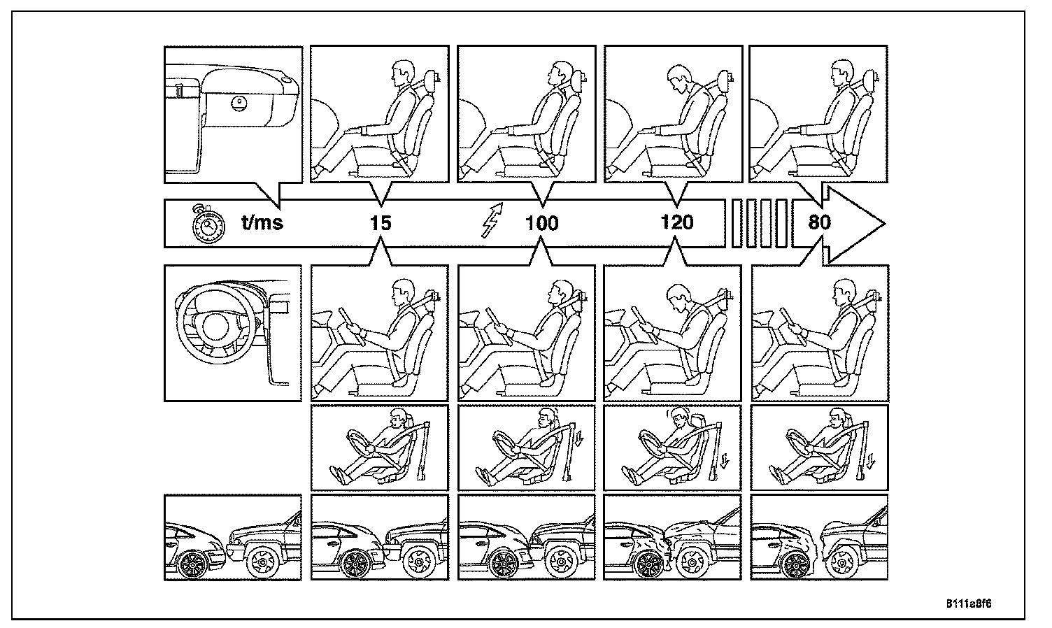 REAR-END COLLISION SRS OPERATIONWhen the ORC registers sudden acceleration which exceeds the forward threshold value a check is made to determine which front seat belts are fastened.The ORC then activates only the SBTs which have fastened seat belts.The driver/passenger airbags are not activated unless a frontal collision which exceeds the stage two threshold is detected.