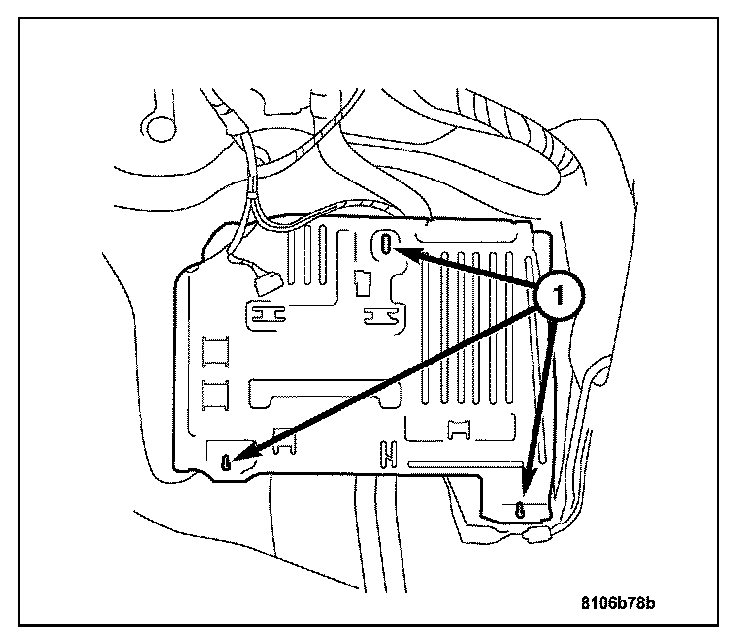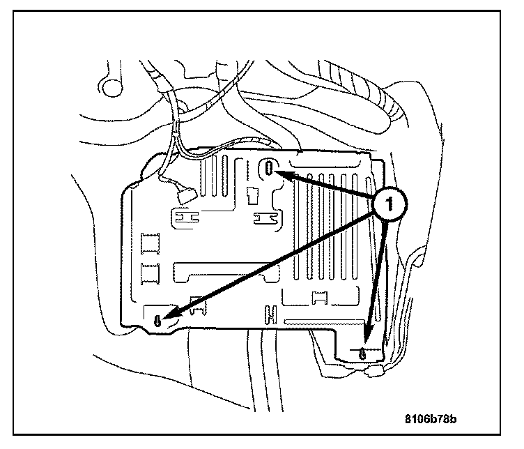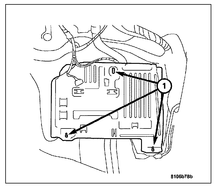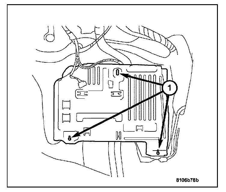 1. Connect the TCM harness connectors and attach the TCM to the base plate with the two retaining screws (1).