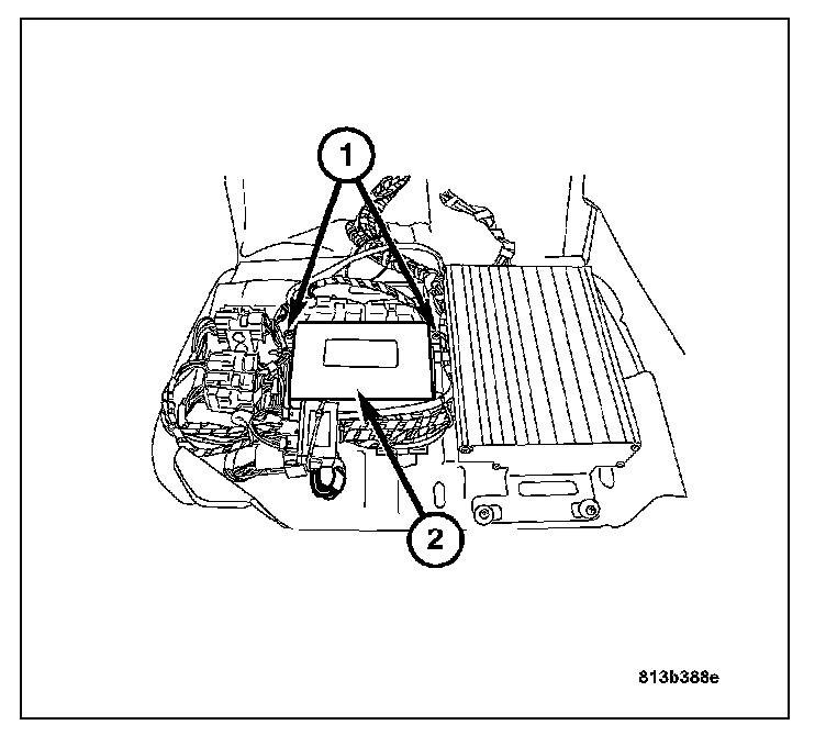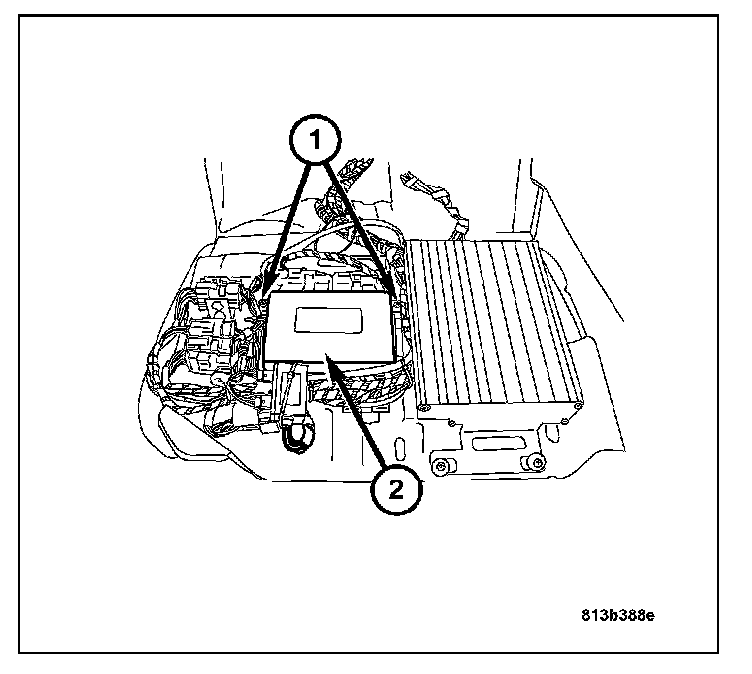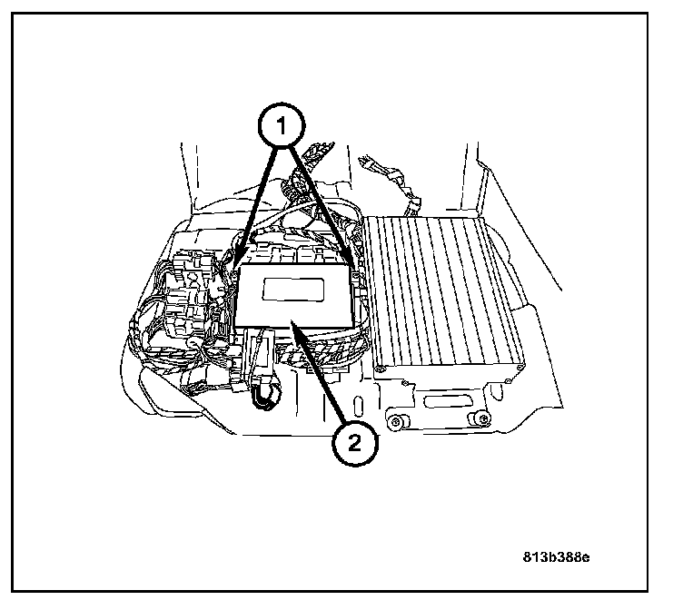 1. Connect the TCM harness connectors and attach the TCM (2) to the base plate with the two retaining screws (1).