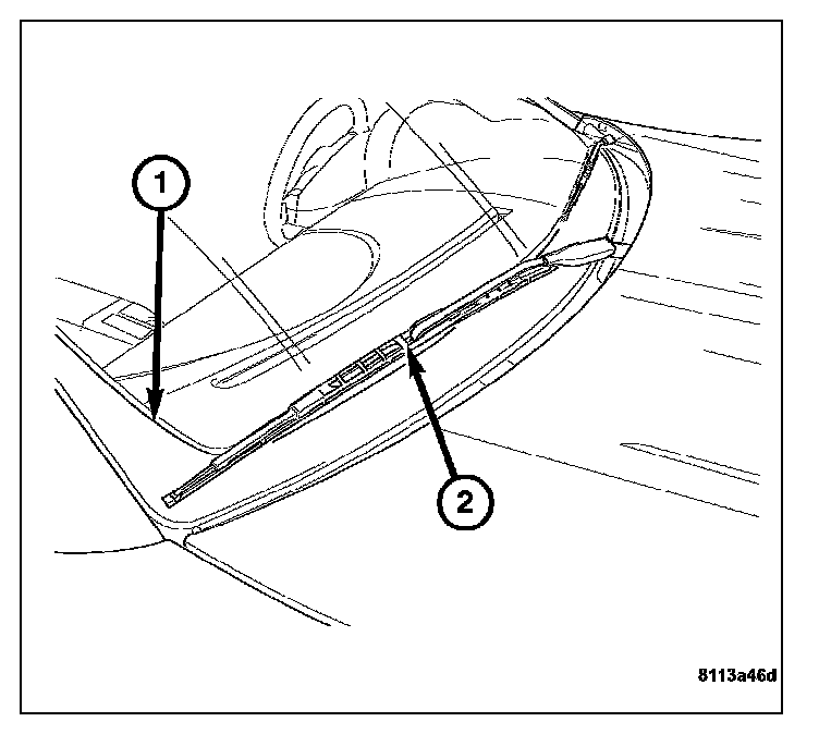 4. Install the wiper arm so the center of the blade (2) is aligned with the top of the dot matrix (1) on the bottom of the windshield and secure.