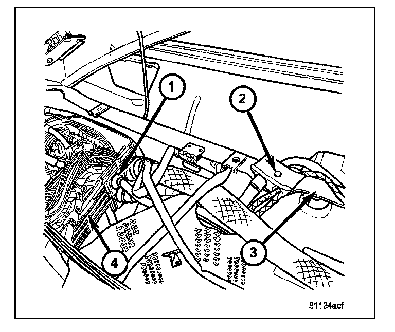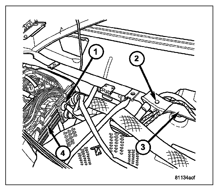 9. Remove the lower wiper module attachment bolt (3) under the cowl ledge (2).