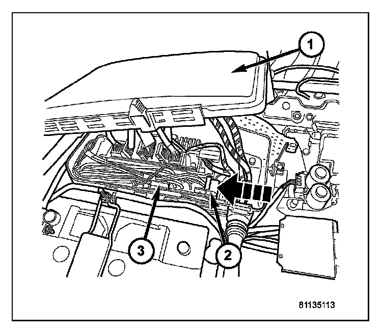 7. Connect the wiper motor harness connector (2) to the Body Control Module (BCM) (3) and slide the locking tab fully over the connector (2).