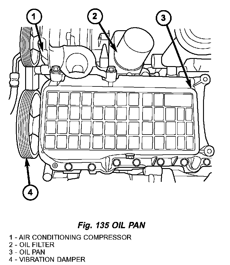 13) Remove oil pan fasteners. Remove oil pan (Fig. 135).